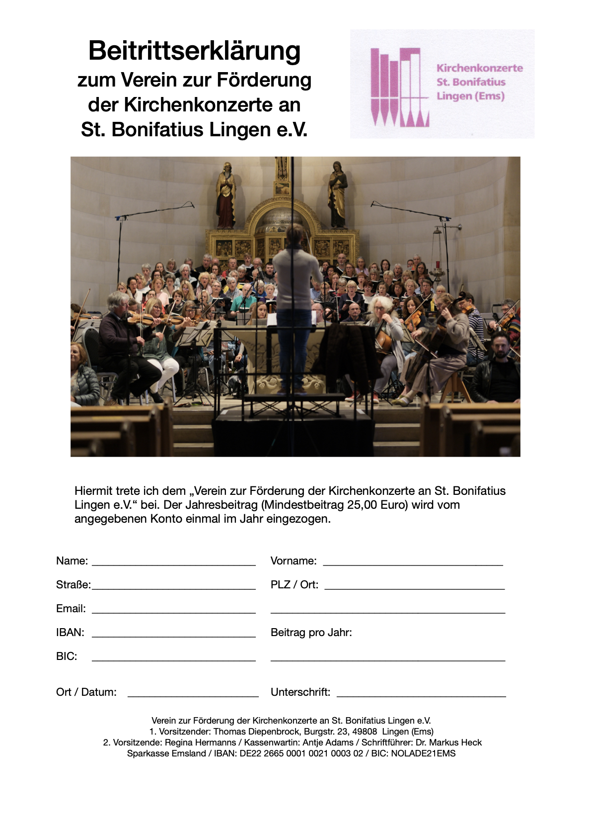 Der Verein zur Förderung der Kirchenkonzerte an St. Bonifatius, Lingen wurde 1995 durch Mitglieder des Chores gegründet, um dem Bonifatius-Chor regelmäßige geistliche Chorkonzerte zu ermöglichen.